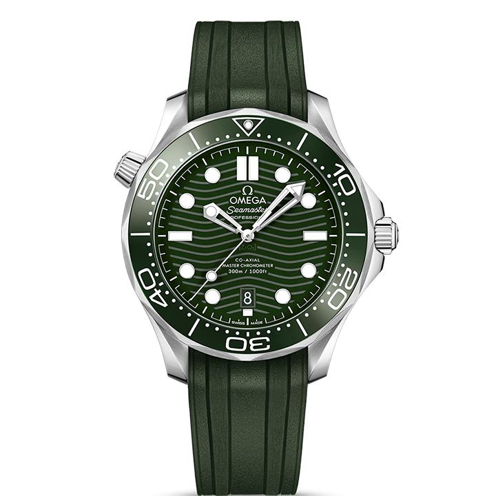 The watch is presented on a green rubber strap and is driven by the OMEGA Master Chronometer Calibre 8800, which can be seen through the sapphire-crystal on the wave-edged caseback.