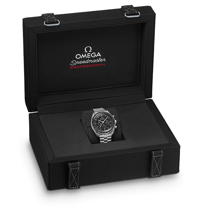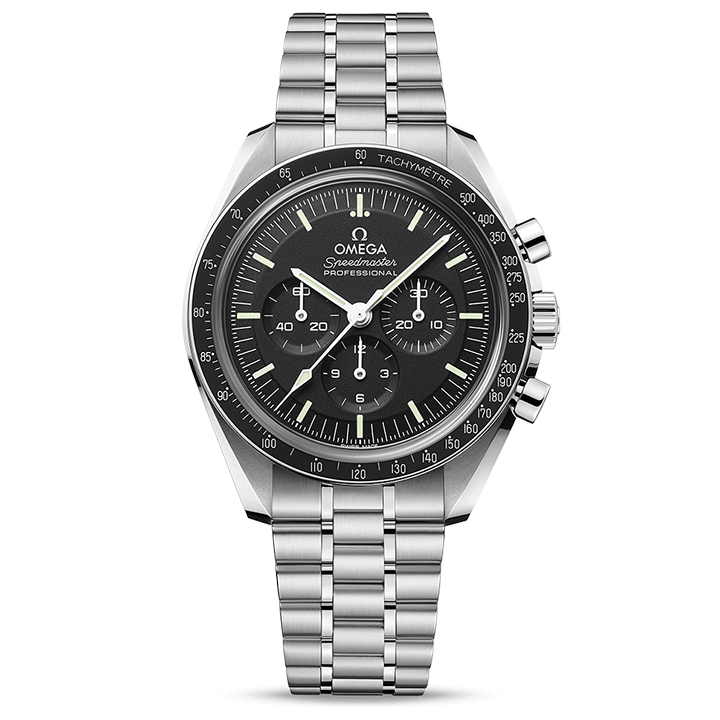 Presented on a polished-brushed five-arched-links-per-row bracelet, this 42 mm Moonwatch in stainless steel features sapphire crystal glass on the front as well as on the caseback. Inspired by the 4th generation Speedmaster style worn on the moon, it also includes an asymmetrical case, black step dial with applied OMEGA logo and the famous dot over 90 on the anodised aluminium bezel ring.