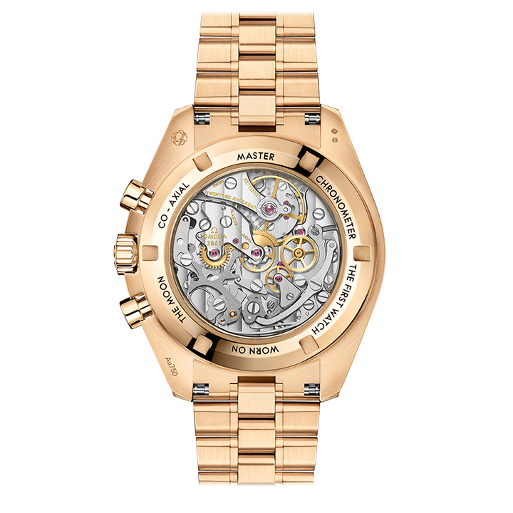 The caseback in polished 18K Moonshine™ Gold has double bevels and the words FIRST WATCH WORN ON THE MOON engraved in black. The Moonwatch is powered by OMEGA’s Co-Axial Master Chronometer Calibre 3861 with special luxury finish.