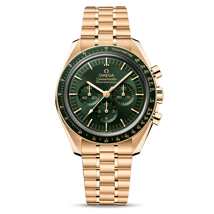 Inspired by the 4th generation Speedmaster, this 42 mm Moonwatch with case and bracelet in 18K Moonshine™ Gold, has a sun-brushed green PVD “step” dial and “Moonwatch” style hands. The green ceramic bezel ring, with OMEGA Ceragold™ tachymeter scale, features the famous dot over 90.