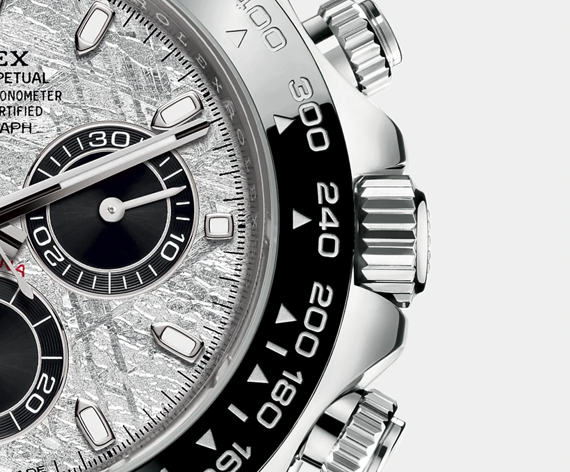 THIS OYSTER PERPETUAL COSMOGRAPH DAYTONA IN 18 CT WHITE GOLD WITH A METEORITE AND BLACK DIAL AND AN OYSTERFLEX BRACELET, FEATURES A BLACK CERACHROM BEZEL WITH TACHYMETRIC SCALE.